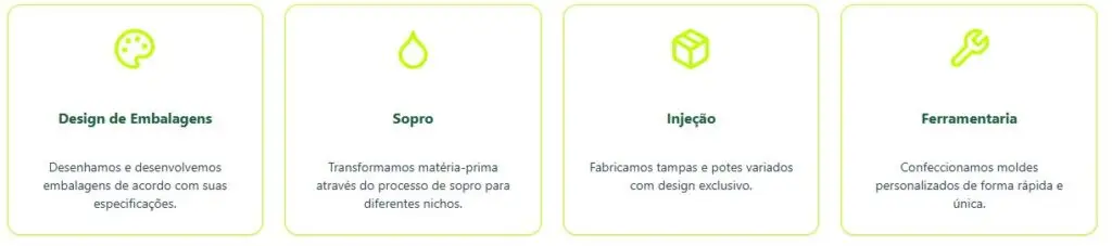 Somos cinco empresas em uma. Atuamos em todas as etapas da fabricação de uma embalagem, desde o desenvolvimento do molde até a rotulagem.